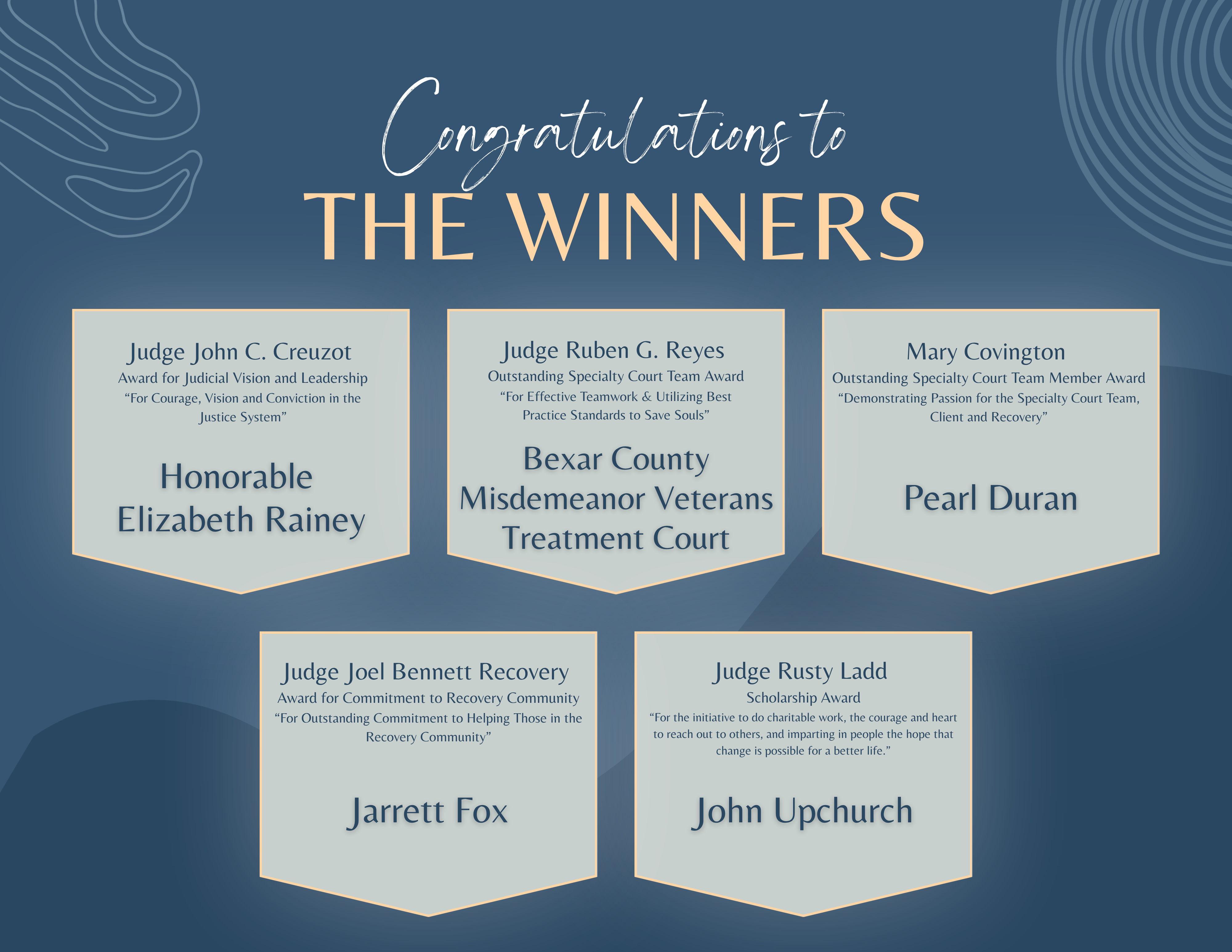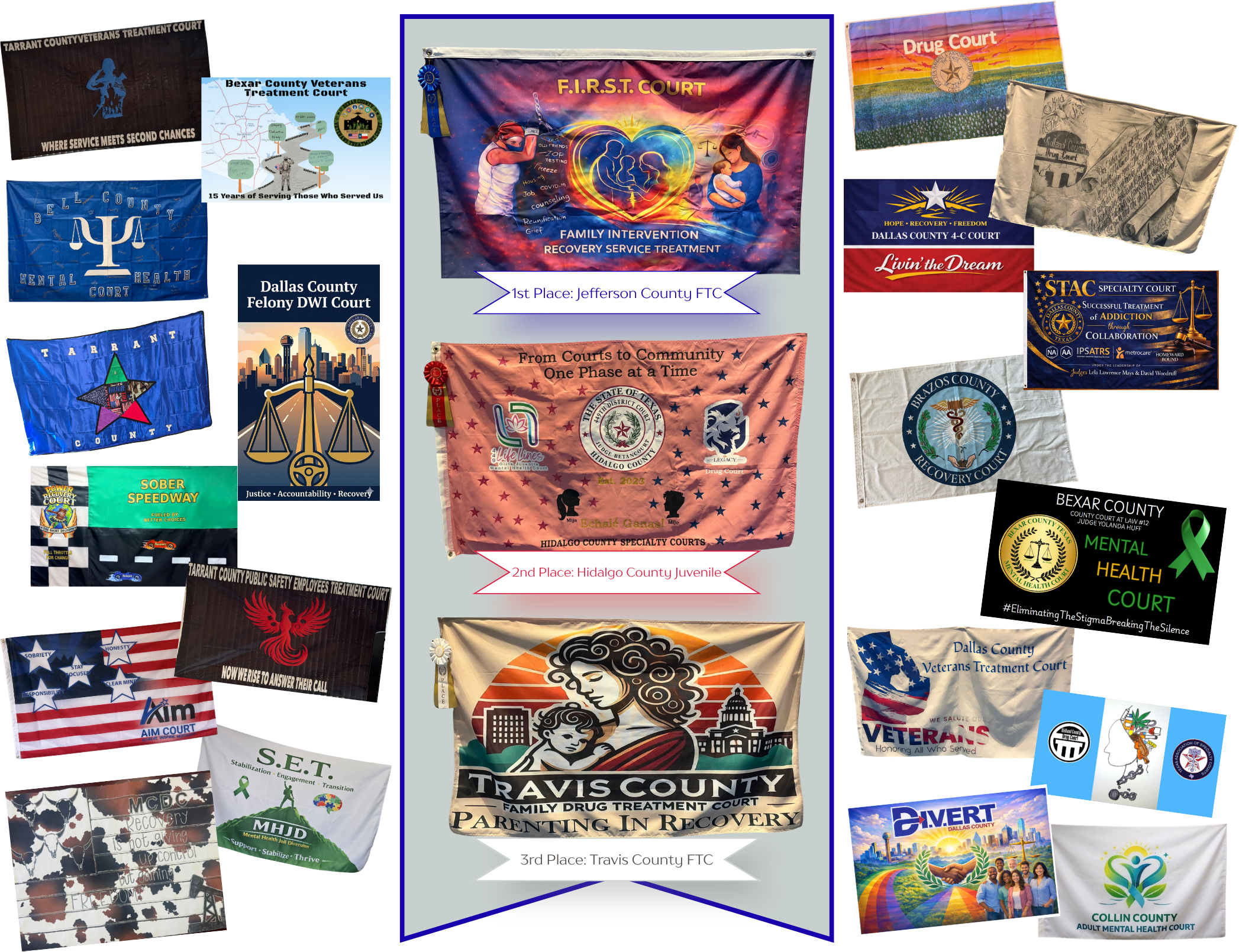 So many of our fantastic specialty courts were represented in Dallas in March as the Texas Association of Specialty Courts held their annual training conference.  Close to 700 professionals gathered to network, fill their toolboxes with new tools, and reinvigorate their passion for this work.  The record number of attendees was reflected in the highest number of submissions for the annual conference contest ever.  23 teams created and submitted entries for the flag contest, which were voted on by attendees.  The flags were submitted with a written description of the meaning of the design and how it reflected their program.  The thoughtfulness displayed was truly impressive.  Take a look at all the entries a well as the award winners that were recognized at the conference!!