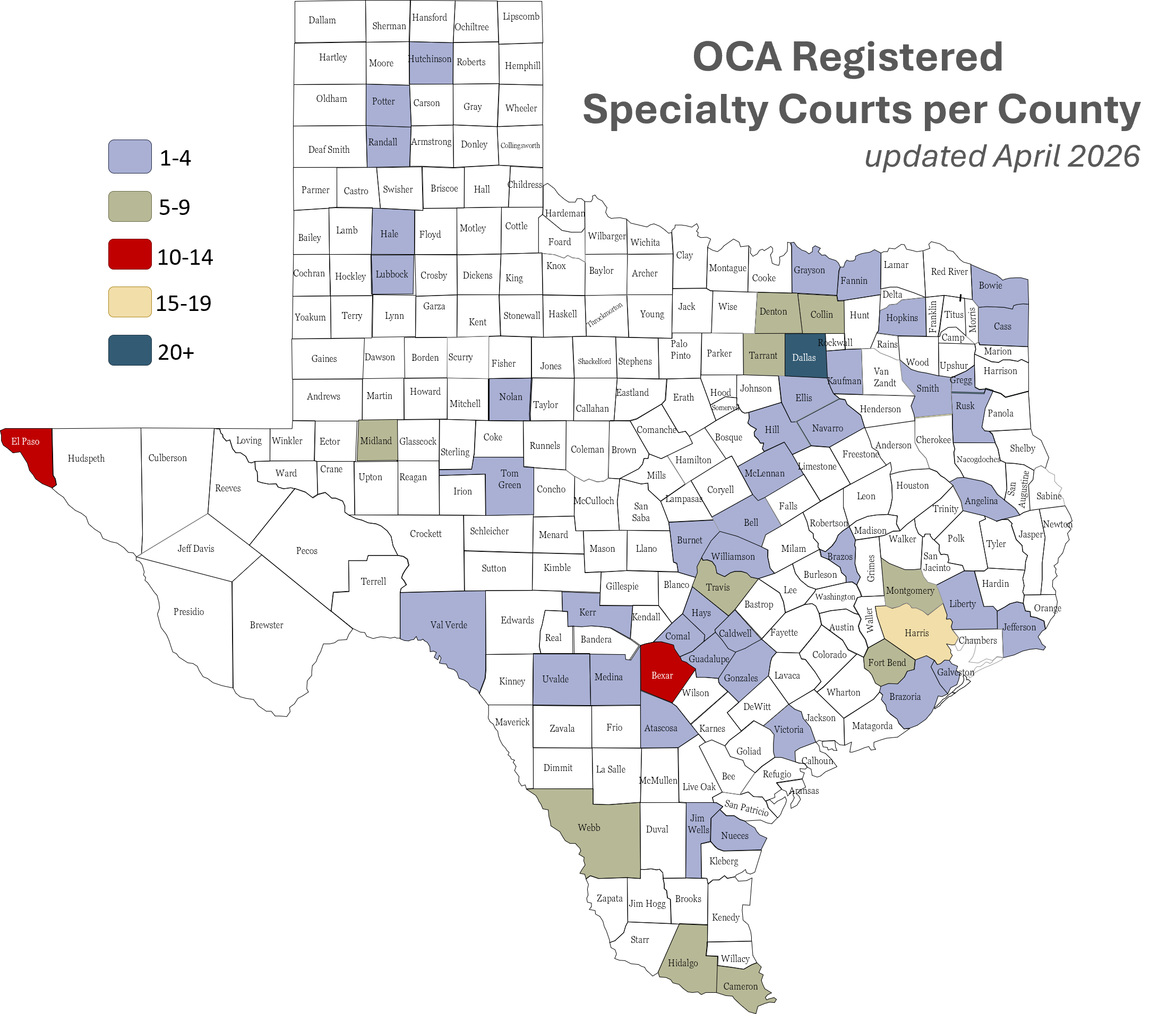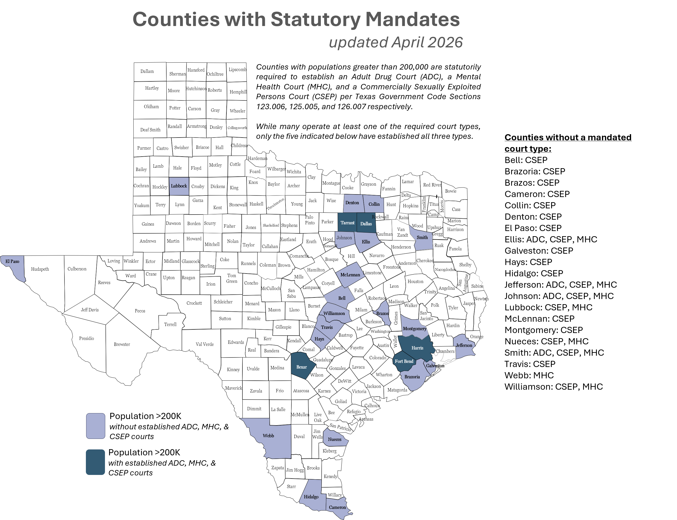 There are currently 212 registered Specialty Courts in Texas. The graphics below highlight the number of courts by type, the number of courts by county, and the counties with statutory mandates for specialty courts. (updated 4/1/2026).