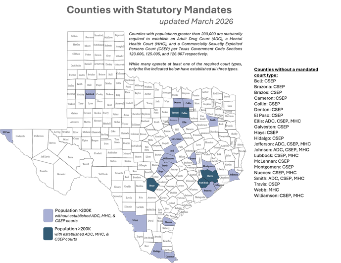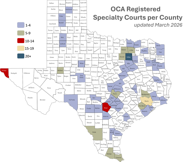 There are currently 213 registered Specialty Courts in Texas. The graphics below highlight the number of courts by type, the number of courts by county, and the counties with statutory mandates for specialty courts. (updated 3/4/2026).